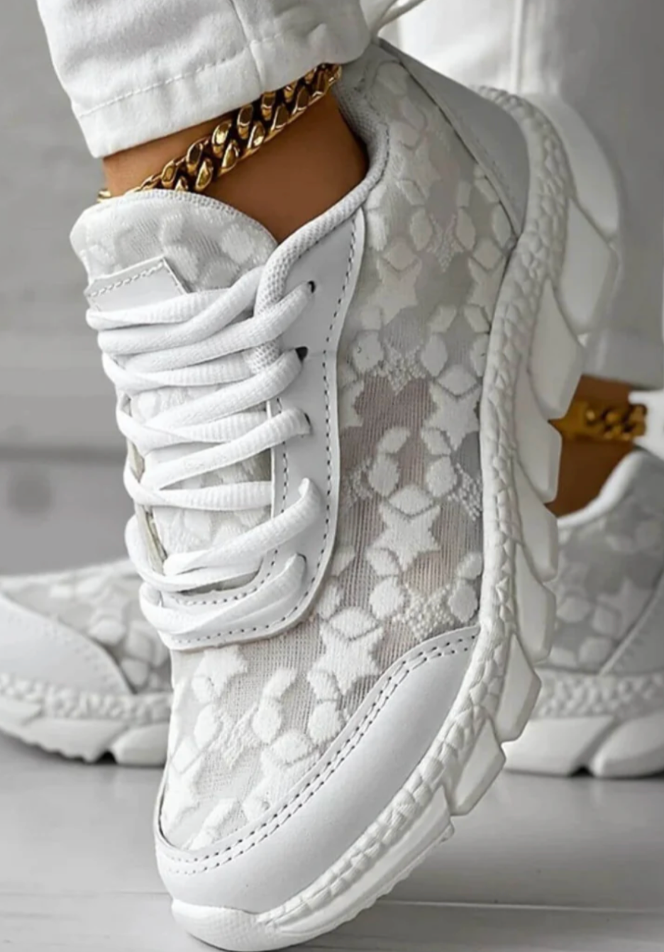 Step into a beautiful balance of charm and comfort with the Elorene BlossomStep Lace Sneakers. These breathable, floral lace mesh sneakers offer a feminine touch to your everyday look — lightweight, stylish, and versatile enough for both errands and evening strolls.